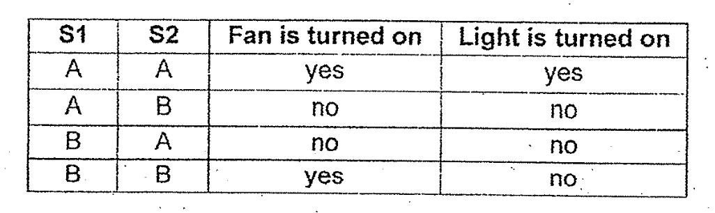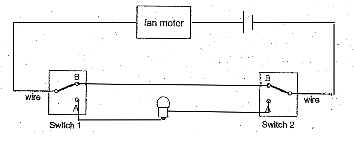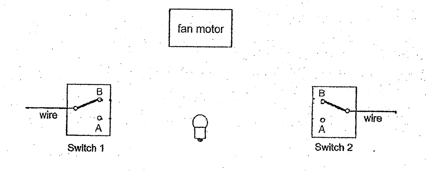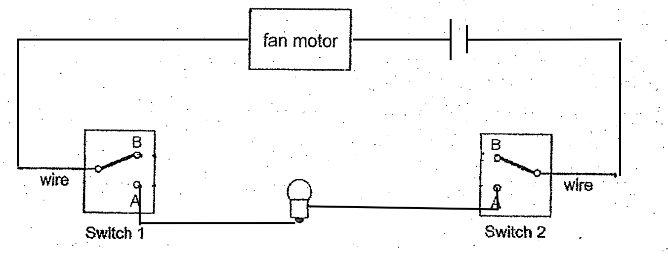 (a) Explanation: From the chart (1st row), we note that when both Switches are turned on to A, both the fan and light are turned on. Therefore, we must draw a circuit that connects both the fan and the light bulb when the switch is connected to A. Don’t forget to add the battery!