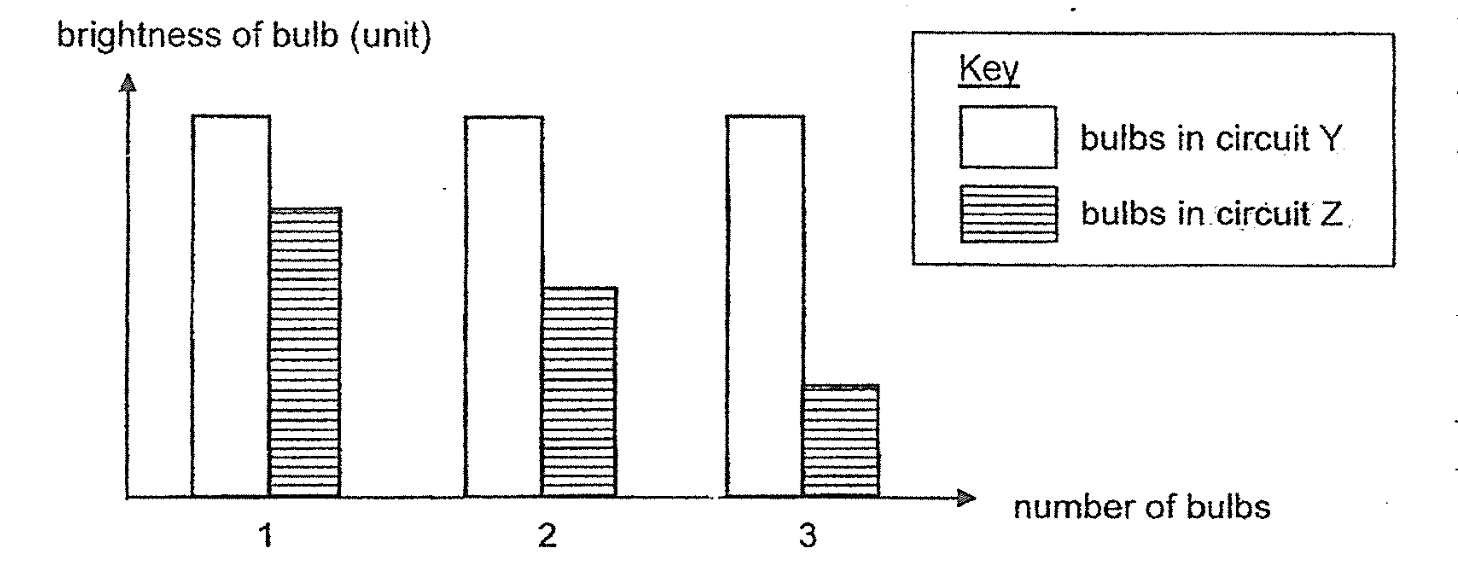 b (i) Explanation: We are comparing how the bulb brightness changes as the number of bulbs increases. In circuit Y, the brightness remained constant. In Circuit Z, the brightness decreased. A parallel arrangement allows current to flow from the battery through the circuit via multiple paths; in this case, flowing to both bulbs equally. Therefore, adding an extra bulb to the circuit will not affect the brightness of both bulbs. In a Series arrangement, current can only flow via a single path. In this case, adding an extra bulb to the circuit will split the current thoughout multiple bulbs, resulting in each bulb becoming dimmer as the number of bulbs increase.