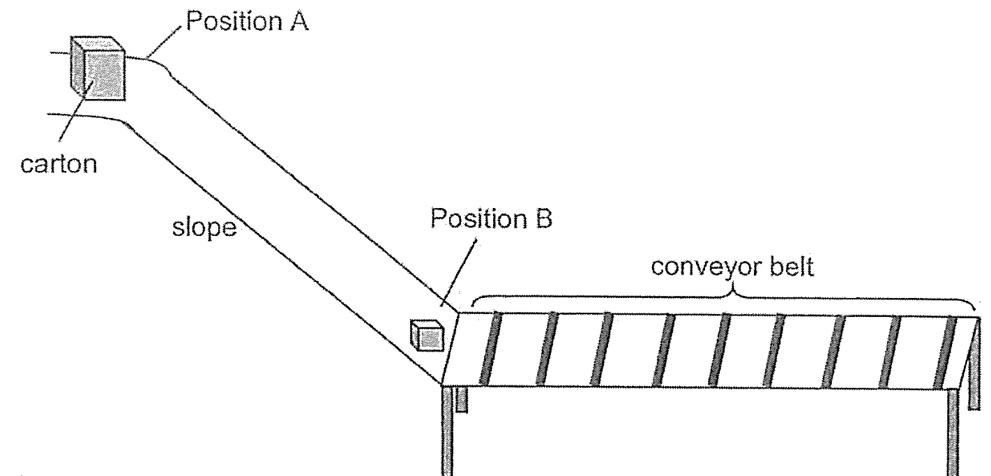 (a) State the energy conversion that allows the conveyor belt to transport the cartons [2]